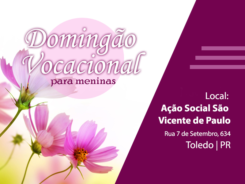 Neste domingo (9/10), acontece o “Domingão Vocacional para Meninas”, promovido pelas Irmãs Terciárias Franciscanas da Beata Angelina, Pequenas Irmãs da Sagrada Família, Filhas da Caridade de São Vicente de Paulo e a Pastoral Vocacional.