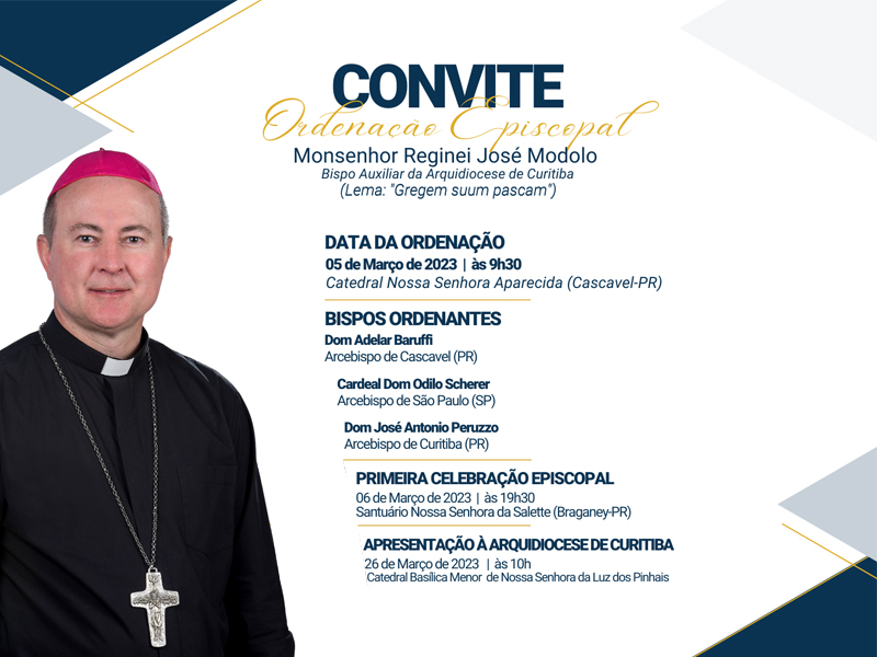 A primeira Missa como Bispo será realizada no dia 6 de março, no Santuário de Nossa Senhora da Salette, em Braganey (PR), às 19h30. Já a apresentação à Arquidiocese de Curitiba está marcada para o dia 26 de março.