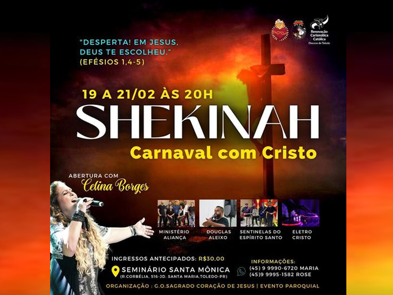 Será o 2° Shekinah em Cristo, tendo como tema deste ano “Desperta, em Jesus, Deus te escolheu”. Serão dias de muita oração e alegria, contando com a presença de vários ministérios: Sentinelas do Espírito Santo, Eletro Cristo, Douglas Aleixo, Ministério Aliança e abertura com show da cantora Celina Borges.