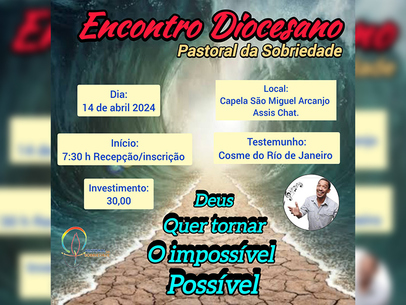 No próximo domingo, dia 14 de abril, acontecerá o Encontro Diocesano da Pastoral da Sobriedade, que terá como tema: “Deus quer tornar o impossível possível”, ministrado pelo leigo Cosme, do Rio de Janeiro, que oferecerá aos participantes um pouco da sua experiência de vida.