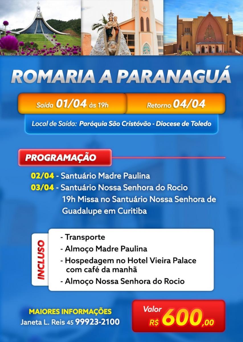 Outras informações na secretaria de sua paróquia ou entre em contato com a Sra. Janeta pelo telefone (45) 9.9923-2100. Aos romeiros, boa viagem e fecunda experiência de fé!