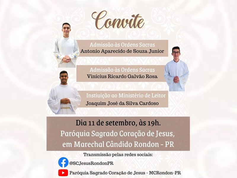 Neste domingo, 11 de setembro, três seminaristas da Etapa da Configuração (Teologia) serão instituídos a Ministérios. A celebração acontece na Paróquia Sagrado Coração de Jesus, em Marechal Cândido Rondon, com início às 19h, sendo também transmitido pelas redes sociais.